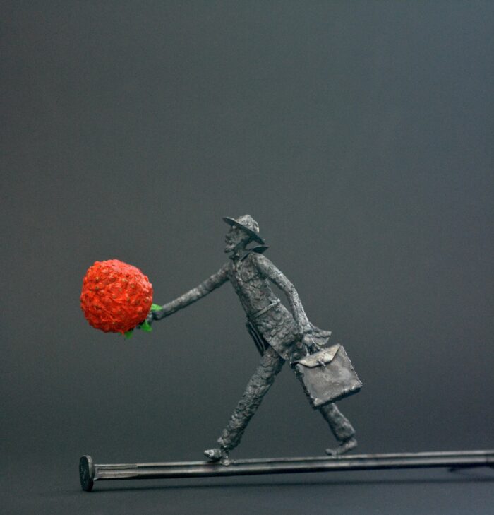 Sven Åke Ekberg The sculptor Sven Åke Ekberg was born in 1946 in Rörum, Sweden. Staying true to his Österlen roots, he has lived among the apple trees in southern Sweden for the whole of his life. Heating everyday iron wire until it becomes malleable, he then forms this into shapes upon which to build from both the inside and out. Small iron clippings are melted and welded to these until characters engaged in various kinds of activities emerge. A lanky young fellow lifts some scrap high above his head. A girl in a short skirt reaches all the way down to her toes so that you can almost feel the stretch in the backs of her thighs. A man in a long coat balances steadily on a sturdy iron nail. On another grey nail stands, rather less certainly, a woman in high heels carrying a handbag. A girl rides by on her bicycle, a bouquet of tulips clamped onto her cycle rack. The activities and forms of body language are seemingly endless and, in each case, expressed with a palpable sense of humour. His work includes, for instance, old pitchforks which have been transformed into candelabra. There is a richness of detail; some elements, such as ties and flowers, have been painted red, which, at least in my own mind, encourages me to continue adding colour to these grey iron miniatures. There is also considerable variation in the positioning of these small figures. Sometimes they are placed in groups, sometimes as solo. Some sculptures stand directly on a podium whereas others are placed on the head of a nail. In some cases, figures balance on the shanks of nails sticking out of the wall. Other tiny characters hang from ceilings or are attached to walls using transparent neon wire. Everything has been thought out with great care according to the artist’s vision of his figures.